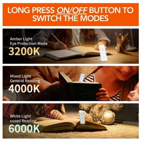 Featuring eye-friendly LED lighting (1W, 3000-6000K), this reading light offers three soothing color modes (White / Warm White / Warm) and three adjustable brightness levels (30%, 60%, 100%) to suit any environment.